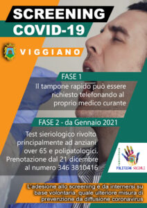 Visti i dati allarmanti di tutta Europa, sull’incidenza di positività tra la popolazione anziana, questa campagna di screening sulla popolazione viggianese, sarà utile per certificare ufficialmente i dati sulla maggior parte della popolazione over 65, sui polipatologici e sugli immunosoppressi. Si precisa che per i testi sierologici bisogna comunque aspettare i principi del mese di gennaio 2021, e che la data di inizio dello screening verrà resa nota in seguito con apposito avviso. Essendo il tutto su base volontaria, sia per il test rapito che per quello sierologico, è consigliabile consultare il proprio medico per scegliere il test più adeguato al quale sottoporsi.